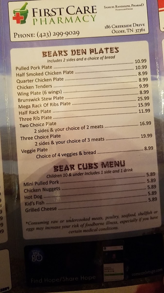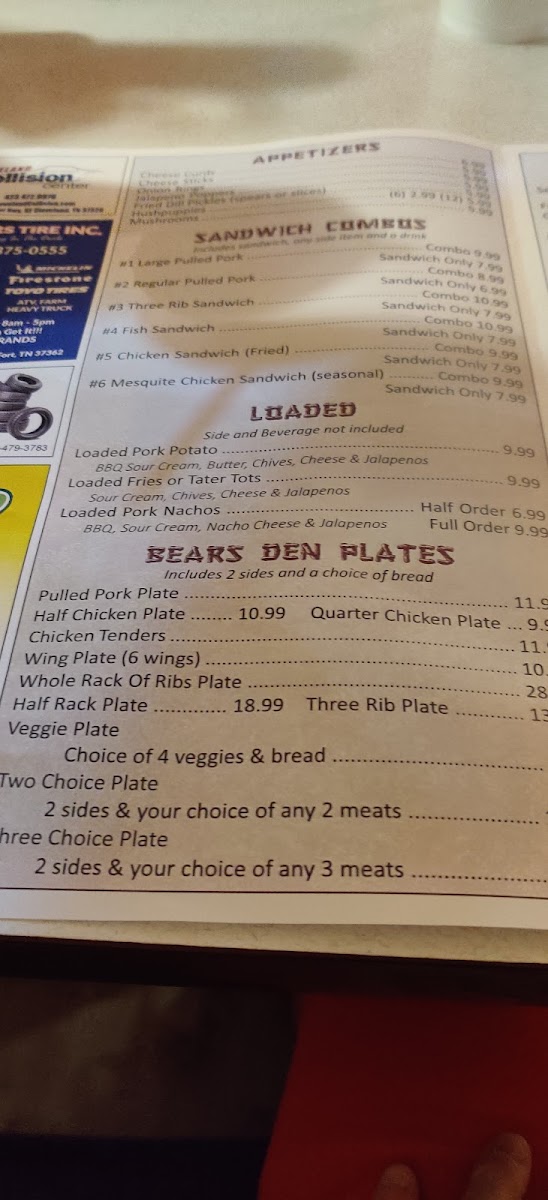Welcome to Bears Den BBQ, a hidden gem located at 130 US-64, Ocoee, TN. Renowned for its friendly atmosphere and mouthwatering dishes, this barbecue joint stands out for its house-made BBQ and homemade sauces. Customers rave about the pulled pork, fried green tomatoes, and the infamous hot slaw, which provides a fiery kick. Ideal for families, the menu offers generous portions at great prices, ensuring everyone leaves satisfied.